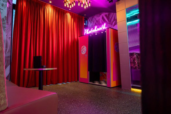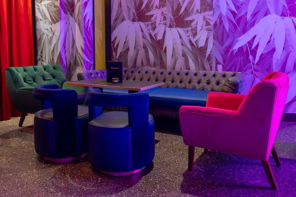 A gorgeous canopy of our Bamboo Breeze wallpaper in this cool hospitality space.